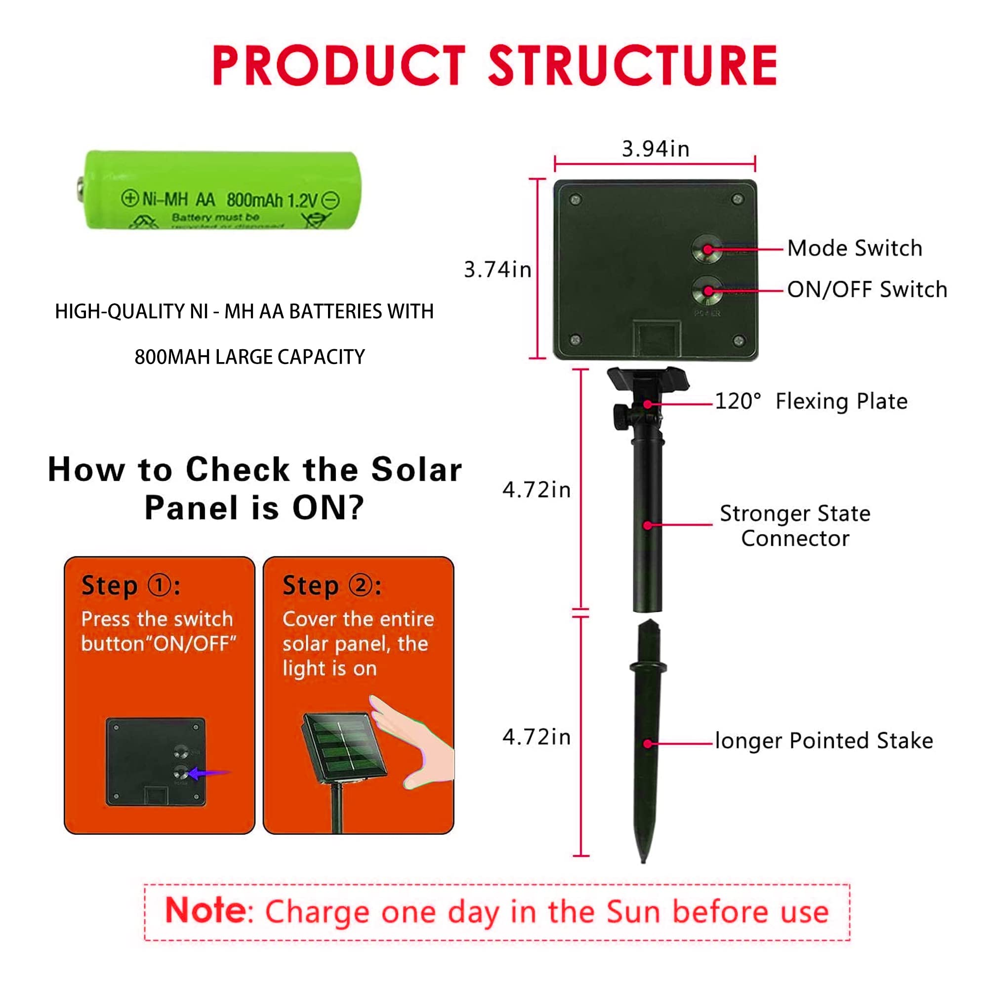 Powered by solar, it can work for 10 to 14 hrs after fully charged. Note: The charging efficiency depends on the weather. Each solar panel is equipped with Ni-MH AA 800m AH battery, which has large capacity for whole night lighting require. Please turn on switch before charging and the string light will automatic illuminate at dark and off at dawn.